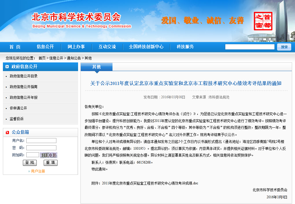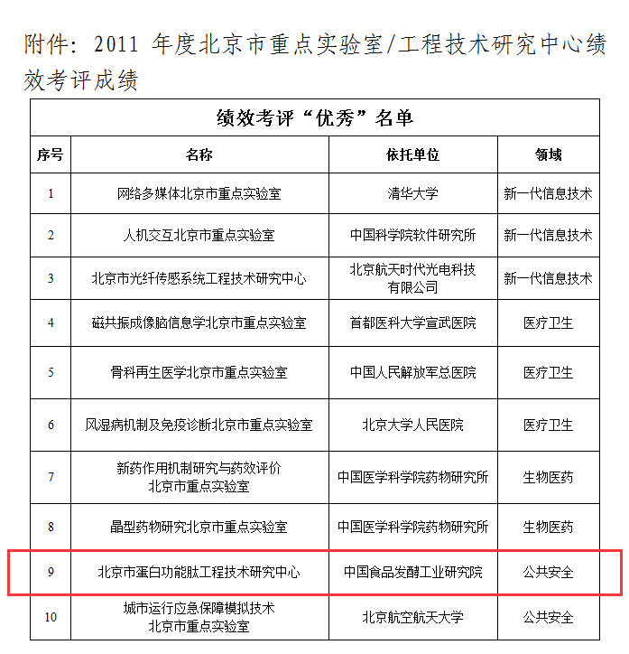 2016年3月8日,經(jīng)北京市科委對(duì)2011年度認(rèn)定的北京市重點(diǎn)實(shí)驗(yàn)室和工程技術(shù)研究中心進(jìn)行績(jī)效考核,北京市蛋白功能肽工程技術(shù)研究中心通過材料考評(píng)、會(huì)議考評(píng)、現(xiàn)場(chǎng)考評(píng),績(jī)效考評(píng)的最終結(jié)果為“優(yōu)秀”,在公共安全領(lǐng)域排名第一,總排名為9/127。這對(duì)于北京市蛋白功能肽工程技術(shù)研究中心進(jìn)一步加強(qiáng)平臺(tái)建設(shè),提升科技創(chuàng)新能力具有重大意義。