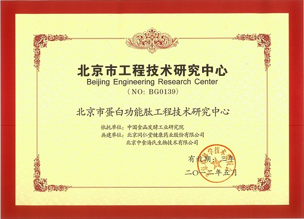 2011年,由北京市科學(xué)技術(shù)委員會(huì)認(rèn)定為北京市重點(diǎn)實(shí)驗(yàn)室。2012年5月,“北京市蛋白功能肽工程技術(shù)研究中心”獲北京市科學(xué)技術(shù)委員會(huì)批準(zhǔn)正式掛牌成立。北京市蛋白功能肽工程技術(shù)研究中心是以中國(guó)食品發(fā)酵工業(yè)研究院為依托單位,北京同仁堂健康藥業(yè)股份有限公司和北京中食海氏生物技術(shù)有限公司為共建單位,建立的國(guó)內(nèi)首個(gè)從事蛋白功能肽研發(fā)的科技創(chuàng)新平臺(tái)。下設(shè)新產(chǎn)品工藝與工程研發(fā)中心、基礎(chǔ)研究中心、營(yíng)養(yǎng)支持與評(píng)價(jià)中心,從基礎(chǔ)研究、工藝與工程化研究、產(chǎn)品研發(fā)、功能性研究、功能性成分分離鑒定和營(yíng)養(yǎng)支持與評(píng)價(jià)等方面全方位為客戶提供系統(tǒng)化服務(wù)。