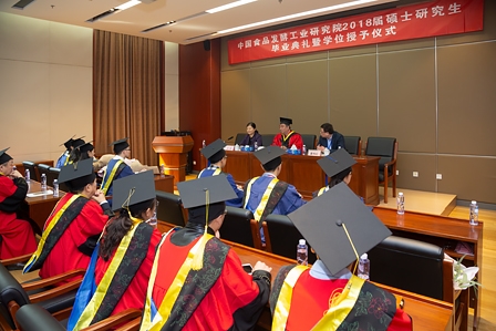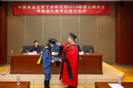 畢業(yè)典禮暨學(xué)位授予儀式在莊嚴(yán)的國(guó)歌聲中開(kāi)始。隨后,王潔副書(shū)記宣讀了中國(guó)食品發(fā)酵工業(yè)研究院關(guān)于授予徐姍姍等8位同學(xué)工學(xué)碩士學(xué)位的決定。在莊嚴(yán)而歡快的音樂(lè)聲中,蔡木易院長(zhǎng)為8位學(xué)位獲得者逐一頒發(fā)畢業(yè)證書(shū)和學(xué)位證書(shū),祝賀他們?nèi)〉玫某煽?jī),并為學(xué)子們“撥穗”,合影留念。