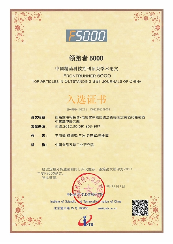 近日,中國(guó)科學(xué)技術(shù)信息研究所發(fā)布了2017年度“領(lǐng)跑者5000-中國(guó)精品科技期刊頂尖學(xué)術(shù)論文”(簡(jiǎn)稱F5000)入選名單,我院王麗娟、柯潤(rùn)輝等人的論文《超高效液相色譜-電噴霧串聯(lián)質(zhì)譜法直接測(cè)定黃酒和葡萄酒中氨基甲酸乙酯》入選,該篇論文于2012年發(fā)表在核心期刊《色譜》。