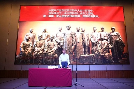 黨課開始前,徐念沙帶領(lǐng)全體與會(huì)人員奏唱國(guó)歌、重溫入黨誓詞。最后,專題黨課在全體參會(huì)人員起立齊唱《我和我的祖國(guó)》中落下帷幕。