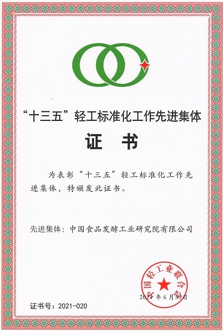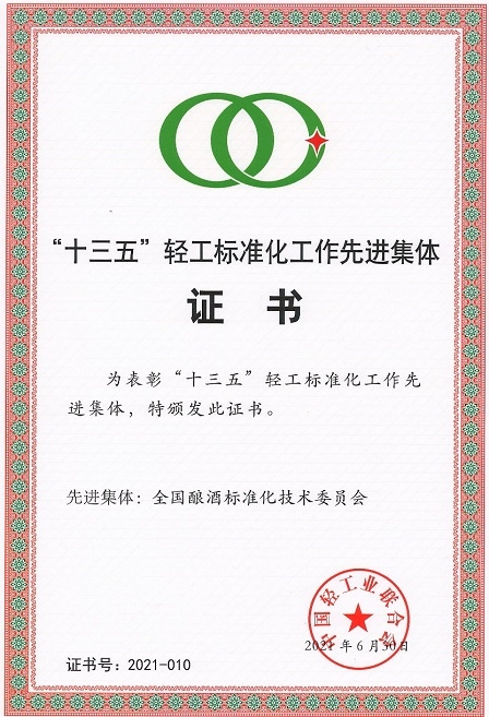 7月6日,中國輕工業(yè)聯(lián)合會在北京召開“2021年度全國輕工行業(yè)標準化工作會議”,會上聯(lián)合會領導通報了“十三五”輕工標準化工作情況,宣讀了 “十三五”期間標準化工作表現突出的先進集體表彰文件。中國食品發(fā)酵工業(yè)研究院及全國釀酒標準化技術委員會雙雙榮獲“十三五”輕工標準化工作先進集體榮譽稱號。
