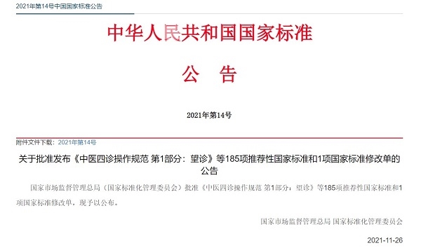 根據(jù)中華人民共和國(guó)國(guó)家標(biāo)準(zhǔn)公告(2021年第14號(hào)),國(guó)家市場(chǎng)監(jiān)督管理總局(國(guó)家標(biāo)準(zhǔn)化管理委員會(huì))批準(zhǔn)《中醫(yī)四診操作規(guī)范 第1部分:望診》等185項(xiàng)推薦性國(guó)家標(biāo)準(zhǔn)和1項(xiàng)國(guó)家標(biāo)準(zhǔn)修改單。