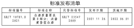 其中,由中國(guó)食品發(fā)酵工業(yè)研究院有限公司所屬全國(guó)白酒標(biāo)準(zhǔn)化技術(shù)委員會(huì)歸口修訂的GB/T 10781.8-2021《白酒質(zhì)量要求 第8部分:濃醬兼香型白酒》一項(xiàng)推薦性國(guó)家標(biāo)準(zhǔn)正式發(fā)布。