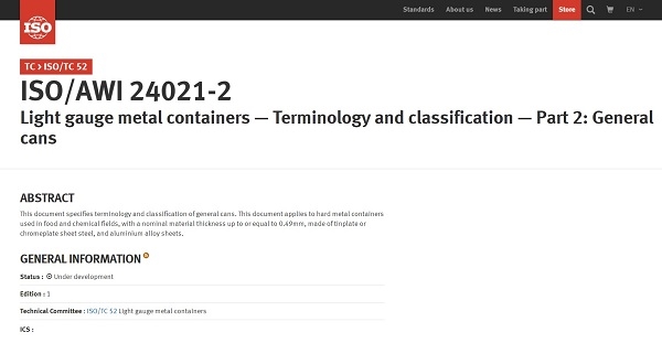 2021年11月26日,由我國(guó)主導(dǎo)的第2項(xiàng)薄壁金屬容器領(lǐng)域術(shù)語(yǔ)國(guó)際標(biāo)準(zhǔn)《薄壁金屬容器-術(shù)語(yǔ)和分類(lèi)-第2部分:通用罐》(ISO/AWI 24021-2)成功立項(xiàng),通用罐金屬容器方向?yàn)槭醉?xiàng)國(guó)際標(biāo)準(zhǔn)。項(xiàng)目研究制定周期為36個(gè)月,并計(jì)劃于2025年正式發(fā)布。