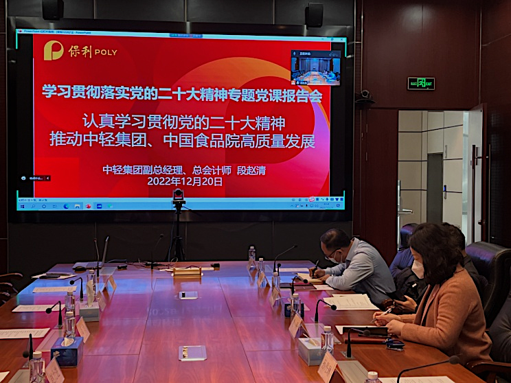 為貫徹落實黨中央、保利集團和保利中輕黨委學(xué)習(xí)宣傳貫徹黨的二十大精神部署安排,2022年12月20日,中輕集團副總經(jīng)理、總會計師段趙清以“認(rèn)真學(xué)習(xí)貫徹黨的二十大精神,推動中輕集團、中國食品院高質(zhì)量發(fā)展”為題,為中國食品院黨員干部、團員青年和統(tǒng)戰(zhàn)人士講授專題黨課,宣講二十大精神,促進(jìn)中國食品院干部員工深刻理解和準(zhǔn)確把握黨的二十大精神、推動高質(zhì)量發(fā)展。黨課以線上和線下相結(jié)合的方式進(jìn)行,由保利中輕總經(jīng)理助理、中國食品院黨委書記、總經(jīng)理肖丹主持,中國食品院黨政領(lǐng)導(dǎo)班子成員、中心主任以上干部、全體黨員、團員、統(tǒng)戰(zhàn)人士及中食公司相關(guān)人員共計200人參加學(xué)習(xí)。