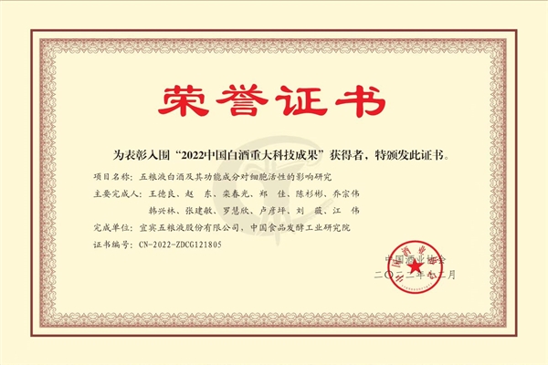 2022年12月17日上午,中國酒業(yè)協(xié)會在“酒都宜賓和美世界”2022中國國際名酒博覽會(簡稱“酒博會”)上發(fā)布了“2022年中國白酒重大科技成果”,中國食品發(fā)酵工業(yè)研究院有限公司、國家酒類品質(zhì)與安全國際聯(lián)合研究中心(ICAB)與五糧液股份有限公司合作的科研項(xiàng)目“五糧液白酒及其活性成分對細(xì)胞活性的影響研究”榮獲“2022年中國白酒重大科技成果”,這是中國食品院聯(lián)合國際國內(nèi)研發(fā)團(tuán)隊(duì)在開展酒與健康科學(xué)研究以來獲得的又一殊榮。