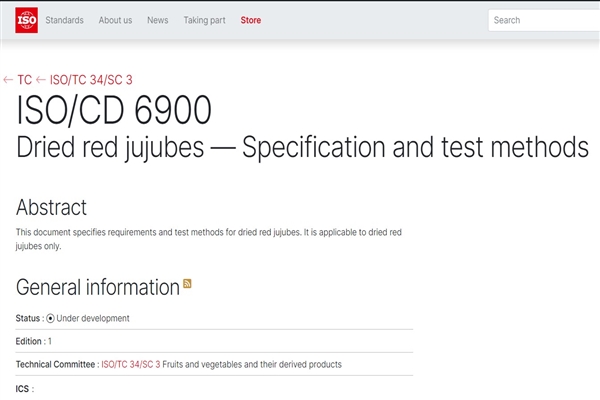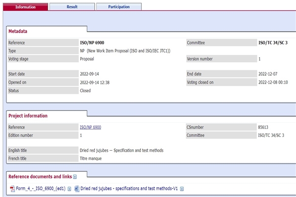 2023年1月11日,由中國(guó)食品發(fā)酵工業(yè)研究院有限公司與國(guó)內(nèi)企事業(yè)單位聯(lián)合提出的《Dried red jujubes – Specification and test methods 干制紅棗-規(guī)格和測(cè)試方法》(ISO/CD 6900)國(guó)際標(biāo)準(zhǔn)成功立項(xiàng)。