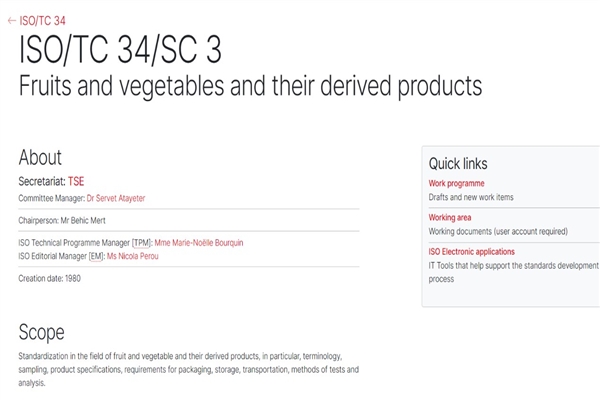國(guó)際標(biāo)準(zhǔn)化組織食品委員會(huì)果蔬及其制品分委會(huì)工作范圍為水果和蔬菜及其制品領(lǐng)域的標(biāo)準(zhǔn)化工作,主要涉及術(shù)語(yǔ)、取樣、產(chǎn)品規(guī)格、包裝要求、儲(chǔ)存要求、運(yùn)輸要求以及檢測(cè)和分析方法方面。目前,該分委會(huì)有18個(gè)積極成員國(guó)和59個(gè)觀察員國(guó),中國(guó)食品院承擔(dān)該分委會(huì)的國(guó)內(nèi)技術(shù)對(duì)口單位工作。