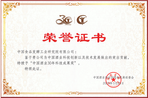 2023年3月26日,在中國酒業(yè)協(xié)會(huì)成立三十周年慶典上,中國酒業(yè)協(xié)會(huì)對(duì)30年來為中國酒業(yè)發(fā)展做出重大貢獻(xiàn)的功勛人物和企業(yè)進(jìn)行了表彰。中國食品發(fā)酵工業(yè)研究院有限公司榮獲“中國酒業(yè)30年科技成果獎(jiǎng)”榮譽(yù)獎(jiǎng)勵(lì)。
