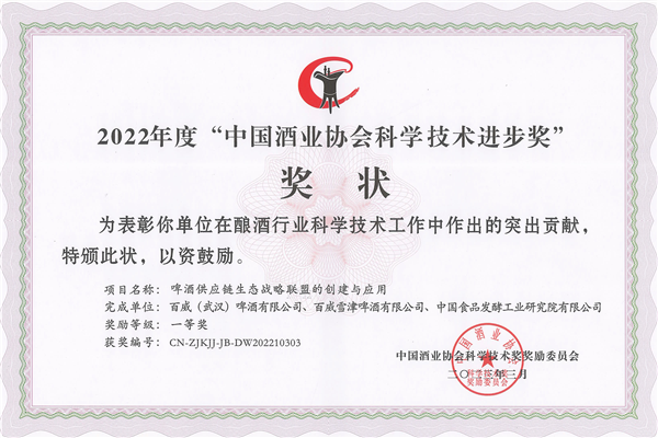 聯(lián)合百威(武漢)和百威(雪津)啤酒有限公司《啤酒供應(yīng)鏈生態(tài)戰(zhàn)略聯(lián)盟的創(chuàng)建與應(yīng)用》項(xiàng)目成果榮獲科學(xué)技術(shù)進(jìn)步一等獎(jiǎng)