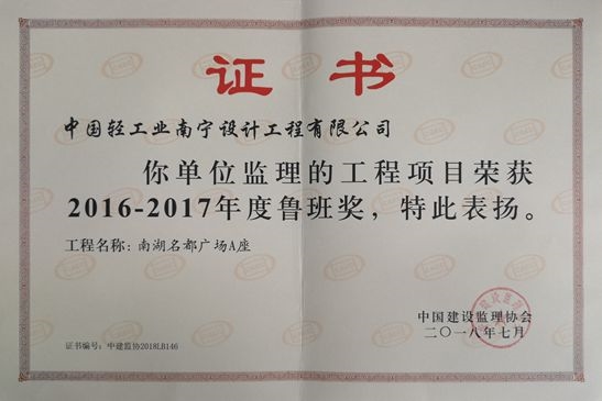 近日,海誠(chéng)股份南寧公司監(jiān)理的工程項(xiàng)目—南湖名都廣場(chǎng)榮獲中國(guó)建設(shè)監(jiān)理協(xié)會(huì)授予“2016-2017年度魯班獎(jiǎng)”。魯班獎(jiǎng)是中國(guó)建筑行業(yè)工程質(zhì)量最高榮譽(yù)獎(jiǎng),這是公司繼廣西壯族自治區(qū)人民檢察院業(yè)務(wù)技術(shù)偵查綜合樓(2005年獲魯班獎(jiǎng))、廣西南寧市國(guó)土交易綜合樓(2011年獲魯班獎(jiǎng))后,再次獲此殊榮,具有里程碑的意義。