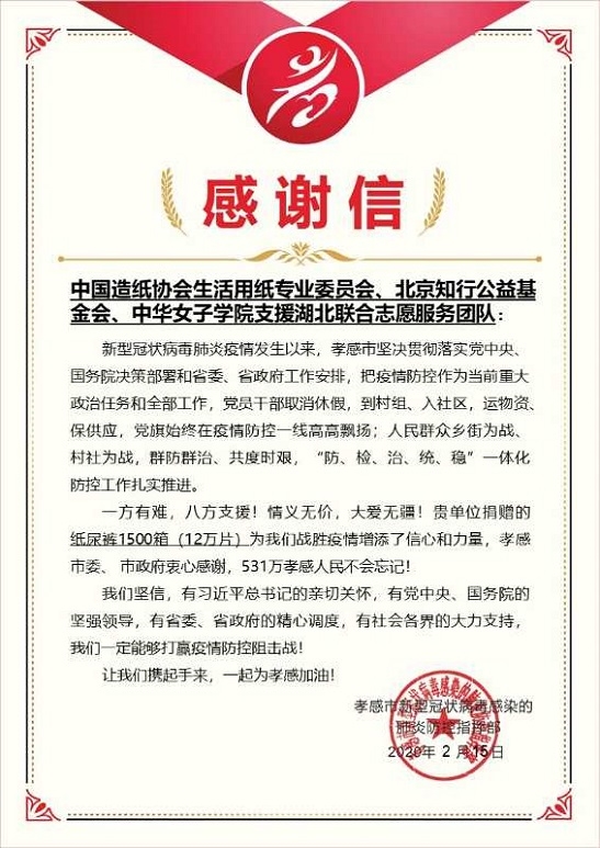 “加油武漢”愛心募捐倡議活動旨在發(fā)動衛(wèi)生用品行業(yè)愛心企業(yè)和愛心人士力量,籌集善款購買成人紙尿褲、成人拉拉褲、經期褲,馳援武漢奮戰(zhàn)在抗疫一線的醫(yī)護人員,齊心協(xié)力抗擊疫情?;顒影l(fā)起后,衛(wèi)品行業(yè)22家企業(yè)、63位個人迅速響應,為抗擊疫情捐獻愛心。截至2月13日,基金會收到捐款169.6882萬元。其中,造紙院捐款5萬元。