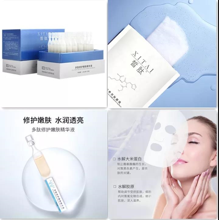 多肽修護(hù)嫩膚精華液和多肽修護(hù)面膜以保利中輕自有專利技術(shù)提取的海洋膠原三肽、大米三肽為核心原料,具有美白、嫩膚、修護(hù)等功效