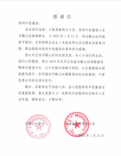 2022年,保利中輕將進(jìn)一步貫徹落實(shí)好中央有關(guān)精神,扎實(shí)推進(jìn)鞏固拓展脫貧攻堅(jiān)成果同鄉(xiāng)村振興有效銜接,踐行央企社會(huì)責(zé)任,以優(yōu)異的幫扶成果向黨的二十大獻(xiàn)禮。