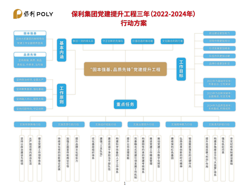 編者按:12月22日,保利集團(tuán)在京召開學(xué)習(xí)貫徹黨的十九屆六中全會精神暨2022年度黨建工作會,會上正式發(fā)布了《保利集團(tuán)“固本強(qiáng)基、品質(zhì)先鋒”黨建提升工程三年(2022-2024年)行動方案》(以下簡稱“《方案》”)。為貫徹落實(shí)《方案》,保利中輕迅速組織傳達(dá)學(xué)習(xí),并特別策劃《黨建提升 保利中輕在行動》專題,計(jì)劃持續(xù)定期報道保利中輕貫徹落實(shí)情況,旨在帶領(lǐng)全體干部員工一同認(rèn)真學(xué)習(xí)、深刻領(lǐng)會,切實(shí)落實(shí)《方案》要求,突出抓基層強(qiáng)基礎(chǔ),推動黨建工作提質(zhì)增效、邁上新臺階,以高質(zhì)量黨建引領(lǐng)保障保利中輕高質(zhì)量發(fā)展,為保利集團(tuán)建設(shè)世界一流,追求卓越,貢獻(xiàn)中輕力量。今天第一期,一起來學(xué)《方案》的主要內(nèi)容。