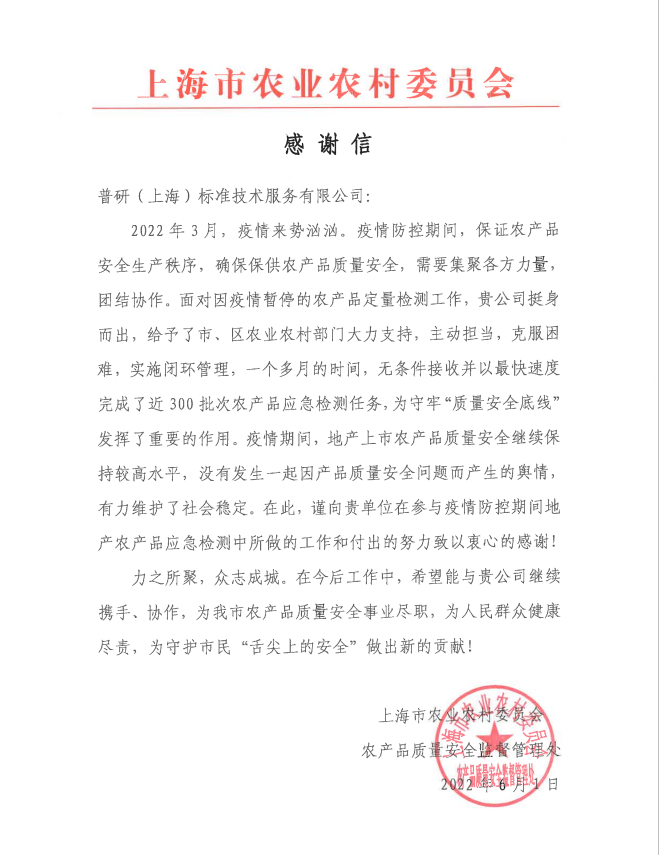 “面對(duì)因疫情暫停的農(nóng)產(chǎn)品定量檢測(cè)工作,貴公司挺身而出,給予了市、區(qū)農(nóng)業(yè)農(nóng)村部門大力支持......” 6月1日,保利中輕所屬中輕檢驗(yàn)認(rèn)證有限公司(以下簡(jiǎn)稱“中輕檢驗(yàn)”)普研(上海)標(biāo)準(zhǔn)技術(shù)服務(wù)有限公司(以下簡(jiǎn)稱“普研標(biāo)準(zhǔn)”)收到一封來自上海市農(nóng)業(yè)農(nóng)村委員會(huì)發(fā)來的感謝信。信中對(duì)中輕檢驗(yàn)普研標(biāo)準(zhǔn)參與上海疫情防控期間農(nóng)產(chǎn)品應(yīng)急檢測(cè)所做的工作和付出的努力致以衷心的感謝。