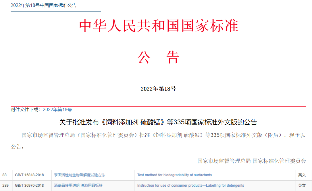 中國日用化學(xué)研究院制修訂的《手洗餐具用洗滌劑》《衛(wèi)生潔具清洗劑》等11項國家標準及《表面活性劑生物降解度試驗方法》《消費品使用說明 洗滌用品標簽》2項國家標準外文版獲批發(fā)布。