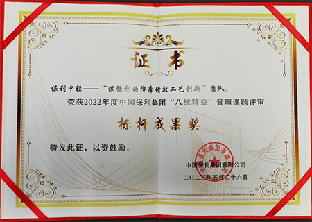 會議期間,舉行了“八維精益”優(yōu)秀成果頒獎典禮。保利集團(tuán)從2022年“八維精益”各項(xiàng)工作成果中評選出83項(xiàng)優(yōu)秀成果獎,其中標(biāo)桿成果獎6項(xiàng)。保利中輕榮獲標(biāo)桿成果獎1項(xiàng)、優(yōu)秀成果獎10項(xiàng),其中,“濕強(qiáng)劑的降本增效工藝創(chuàng)新”課題獲得標(biāo)桿成果獎。該課題團(tuán)隊(duì)通過不斷優(yōu)化濕強(qiáng)劑生產(chǎn)技術(shù)方案,成功研制出低成本高質(zhì)量生產(chǎn)技術(shù),提升了產(chǎn)品市場份額和競爭力,實(shí)現(xiàn)客戶成本降低15%。
