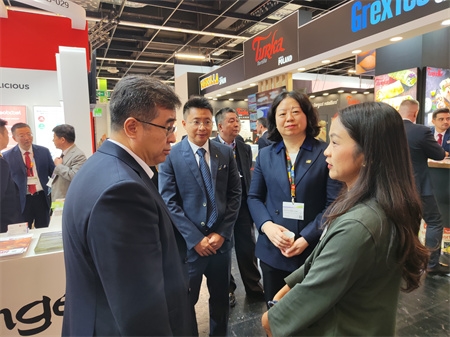展臺首日即吸引了來自歐亞等產(chǎn)業(yè)鏈上下游參展企業(yè)和觀眾的持續(xù)關(guān)注。保利集團總經(jīng)理助理,保利中輕黨委書記、董事長安勝杰來到中國食品發(fā)酵工業(yè)研究院展臺,親切慰問參展員工,并前往安琪酵母、加拿大Saputo乳業(yè)公司、法國SILL SAS集團、荷蘭Salud Foodgroup Europe BV等相關(guān)展臺進行交流,與世界食品博覽會(Anuga)主辦方就未來有關(guān)合作進行交流,并接受主辦方專題采訪。