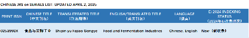 4月7日,保利中輕所屬中國(guó)食品發(fā)酵工業(yè)研究院(簡(jiǎn)稱“中國(guó)食品院”)主辦的學(xué)術(shù)期刊《食品與發(fā)酵工業(yè)》成功入選國(guó)際數(shù)據(jù)庫(kù)《工程索引》(EI Compendex),成為全球被收錄的79種食品科學(xué)類期刊之一。這是《食品與發(fā)酵工業(yè)》發(fā)展歷程中又一重要里程碑,標(biāo)志著該期刊學(xué)術(shù)價(jià)值、研究質(zhì)量及國(guó)際化水平獲得國(guó)際權(quán)威機(jī)構(gòu)的高度認(rèn)可與肯定,彰顯中國(guó)食品院科技期刊學(xué)術(shù)引領(lǐng)力和國(guó)際影響力得到極大提升。