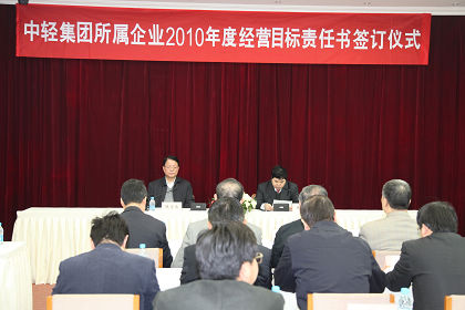 中國(guó)輕工集團(tuán)公司所屬企業(yè)2010年度經(jīng)營(yíng)目標(biāo)責(zé)任書簽訂儀式于3月30日在集團(tuán)總部舉行,集團(tuán)公司領(lǐng)導(dǎo)、集團(tuán)公司部門負(fù)責(zé)人、二級(jí)企業(yè)主要負(fù)責(zé)人出席了儀式。