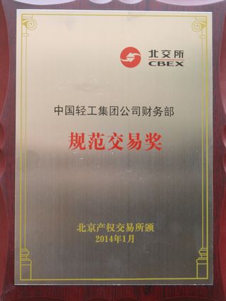 2014年1月北京產(chǎn)權(quán)交易所對25家國有產(chǎn)權(quán)交易規(guī)范操作的央企進(jìn)行表彰,中輕集團(tuán)財(cái)務(wù)部獲規(guī)范交易獎(jiǎng)。