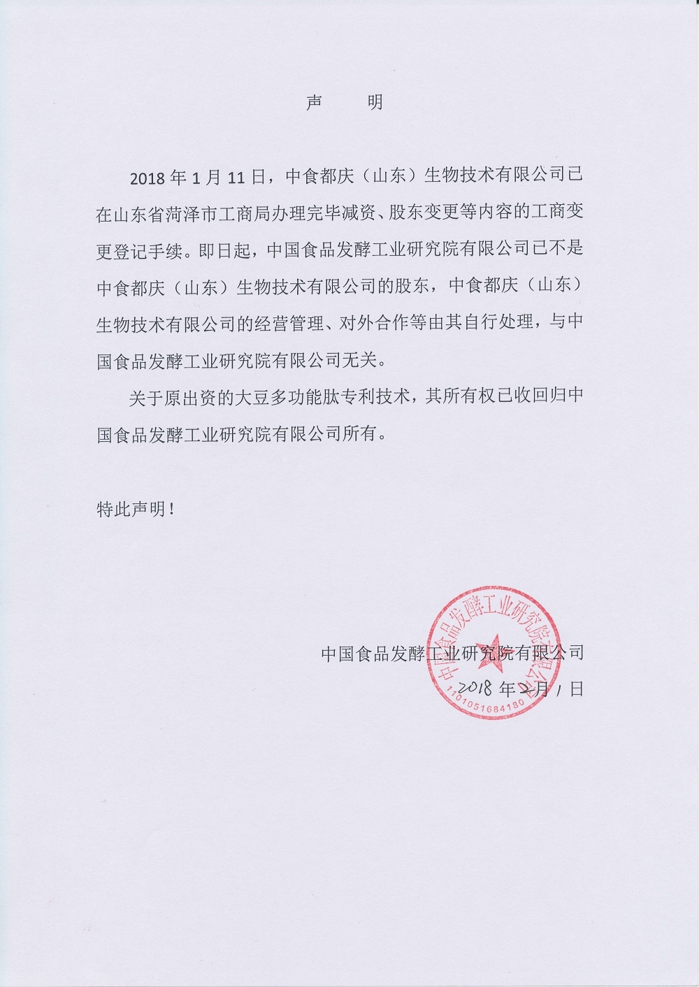 我院與中食都慶(山東)生物技術(shù)有限公司解除股東關(guān)系及專利技術(shù)收回聲明