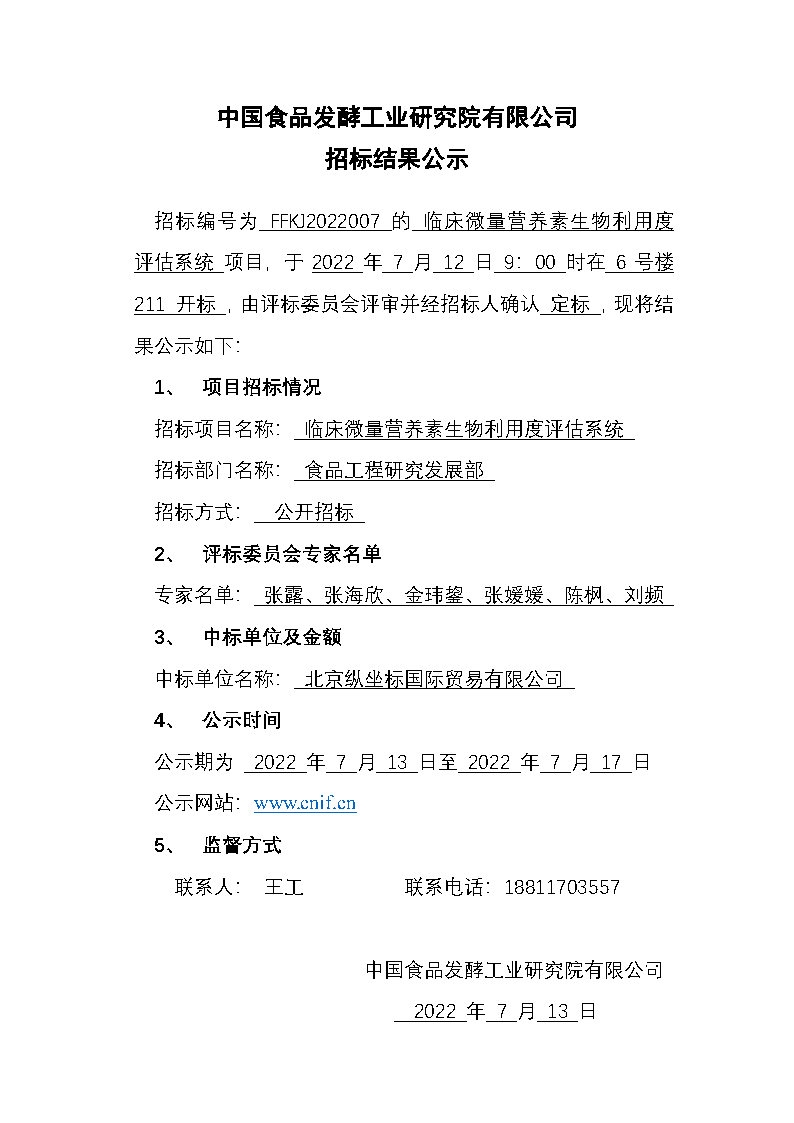 招標(biāo)結(jié)果公示——臨床微量營(yíng)養(yǎng)素生物利用度評(píng)估系統(tǒng)(招標(biāo)編號(hào):FFKJ2022007)