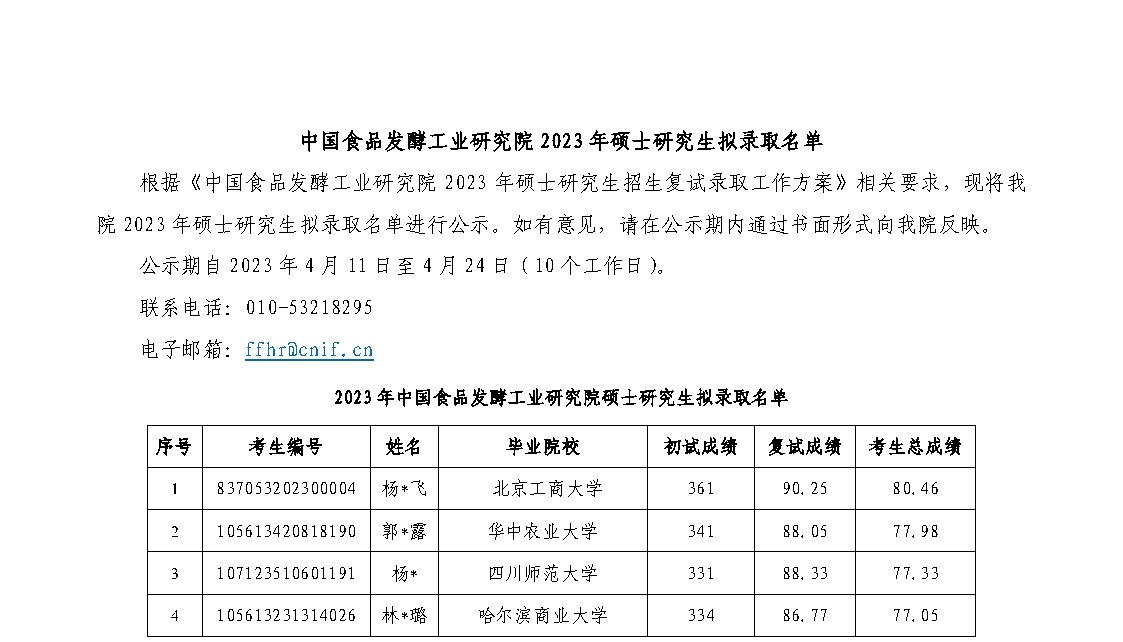 中國食品發(fā)酵工業(yè)研究院2023年碩士研究生擬錄取名單