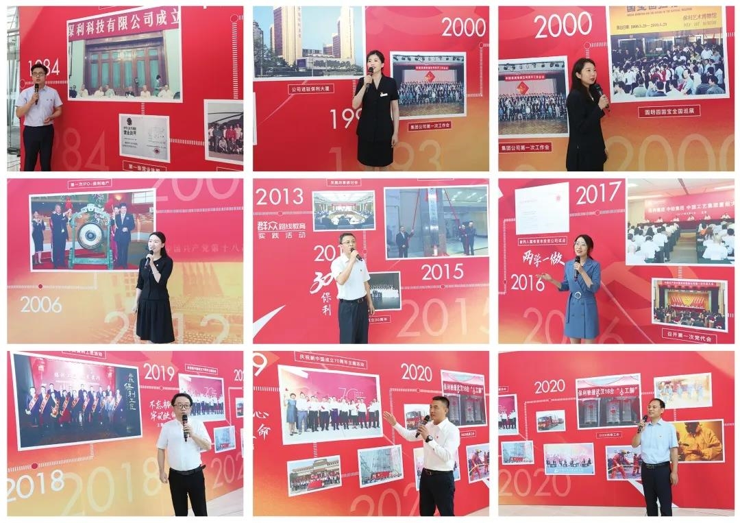 在國(guó)歌奏唱聲中,活動(dòng)拉開(kāi)帷幕。來(lái)自不同業(yè)務(wù)板塊的9名黨員接力講述保利故事,在他們的講述下,集團(tuán)公司36年發(fā)展史徐徐展開(kāi)。